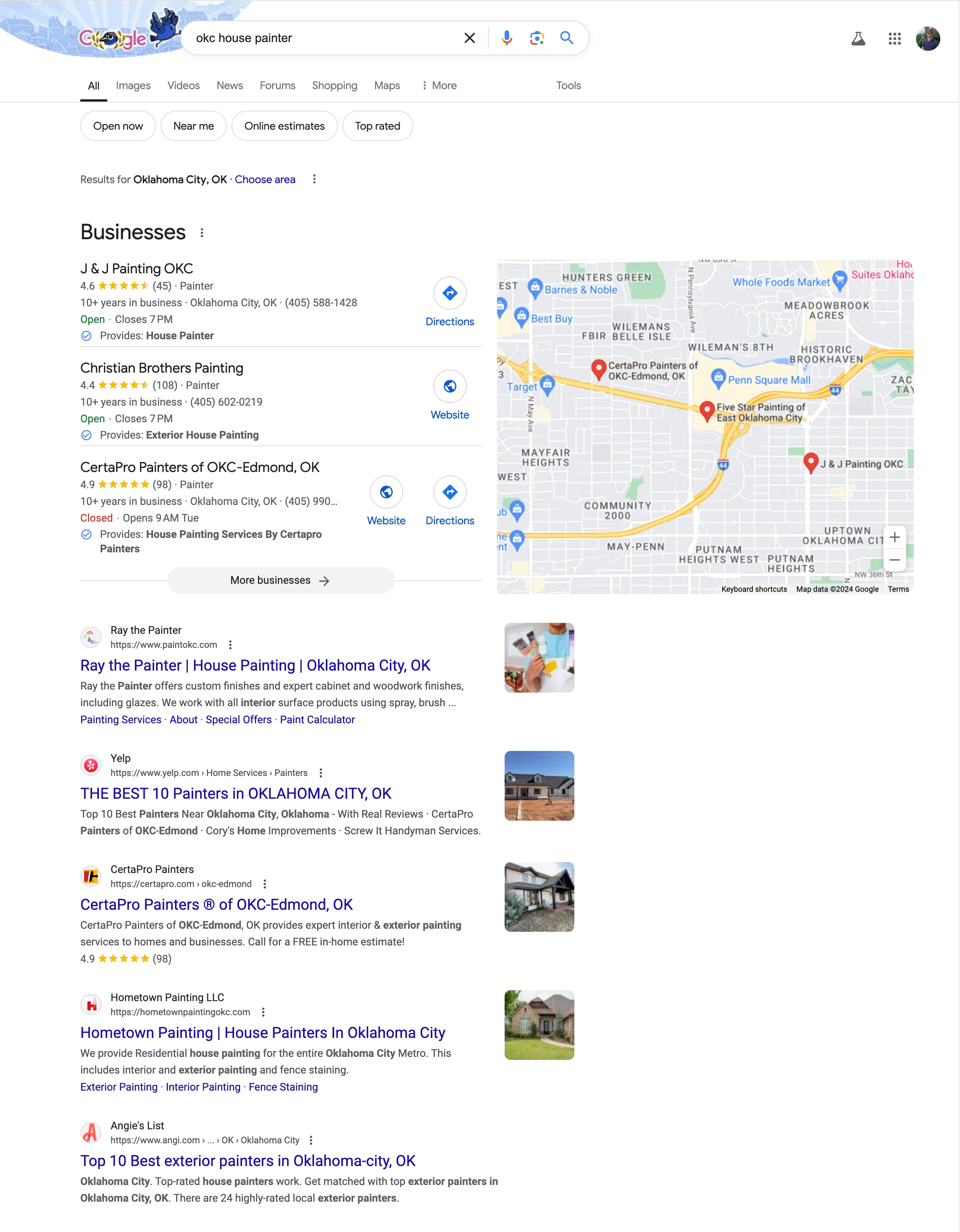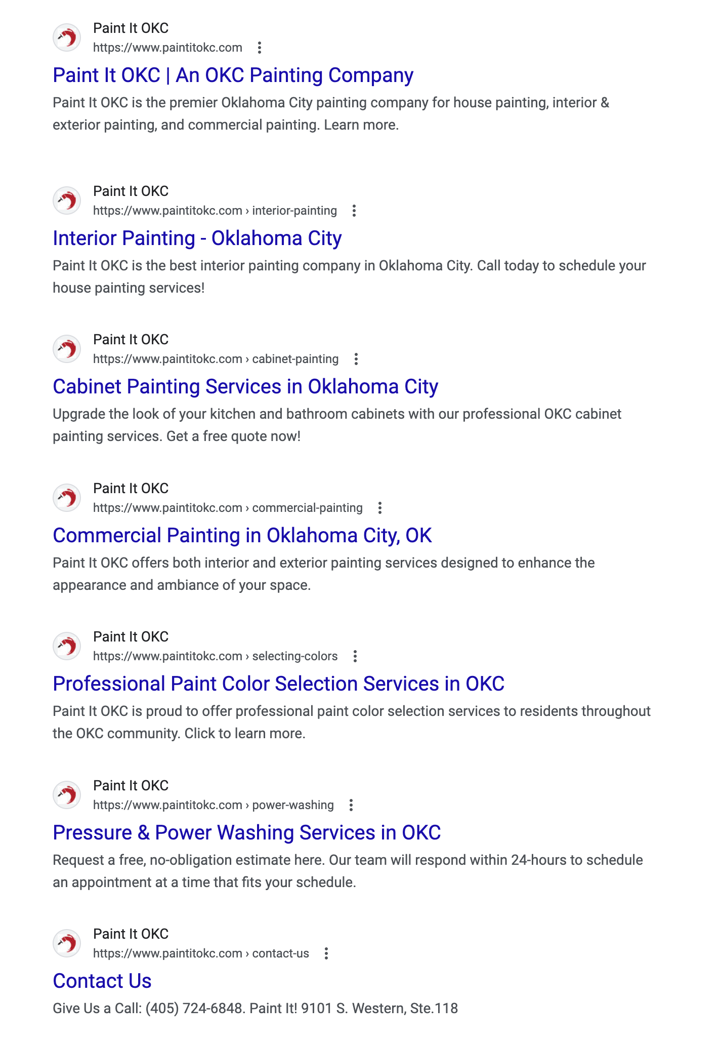 Next, I optimized all on-page elements (titles, meta descriptions, headings), added alt text to images, and added internal links throughout the site to improve SEO signaling. I also added Paint It OKC to relevant online directories and review sites to improve their local presence, and created an outreach strategy to acquire backlinks from other local businesses and painting industry websites.