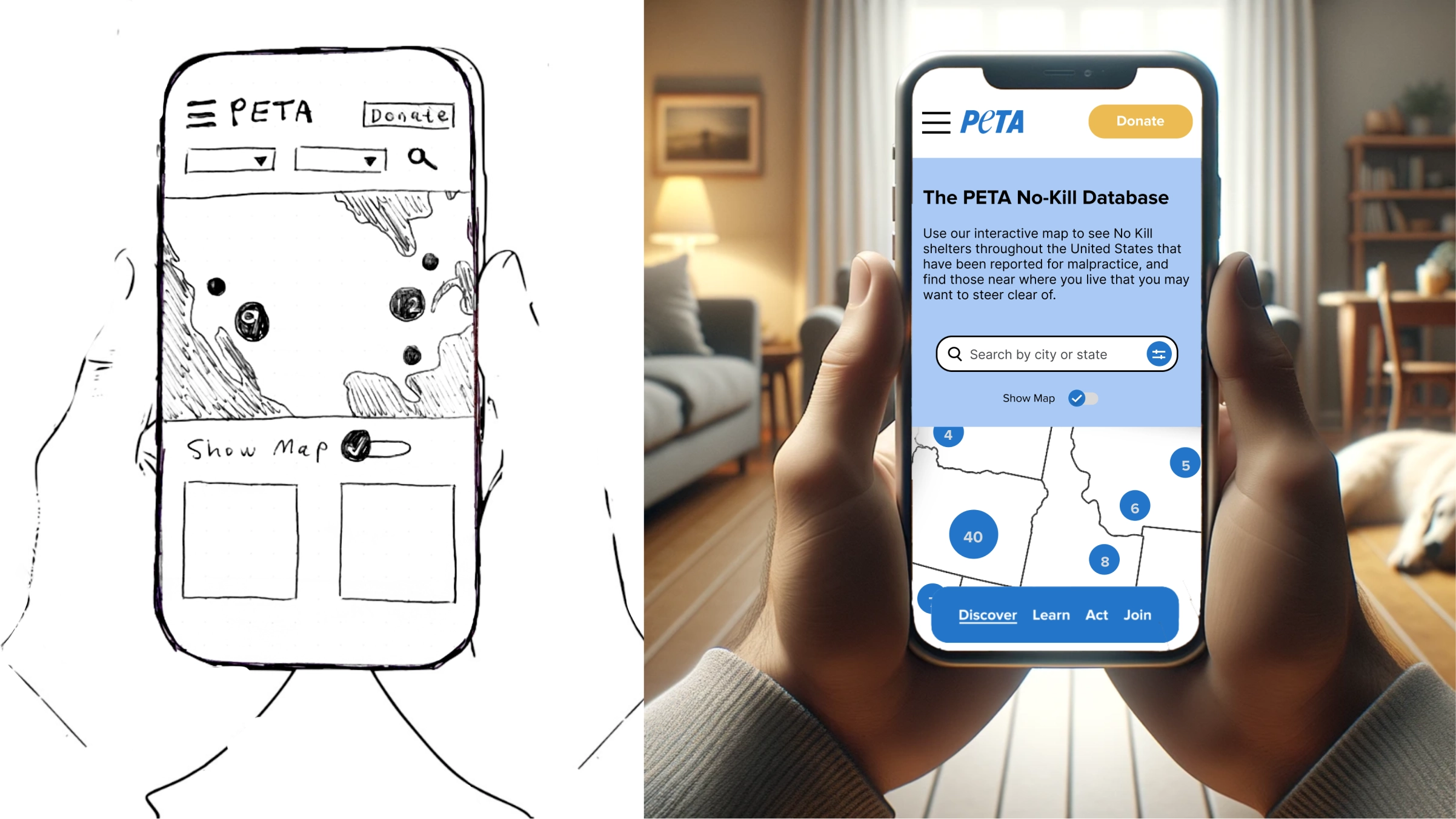 PETA partnered with SVC Seattle—a vocational school that offers UX programs where I was then a student—and challenged my team to redesign the page. My team was made up of two UX designers and two UX writers. I led the design of the mobile version of the database over a two-month period, and I collaborated with another designer on the desktop version.