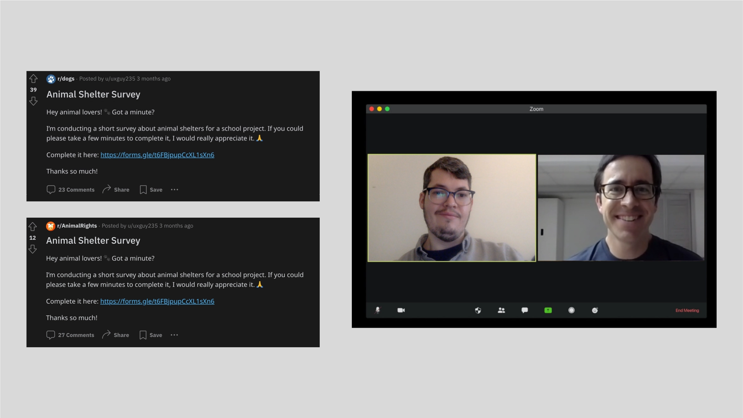 To gain a better understanding of the user perspective on the topic, I conducted several in-person, moderated interviews and shared a survey online, to gather a larger sample of perspectives. I wanted to know how pet owners feel about animal shelters as a whole, what they knew about no-kill policies, and what factors they typically consider when choosing a shelter to surrender a pet.