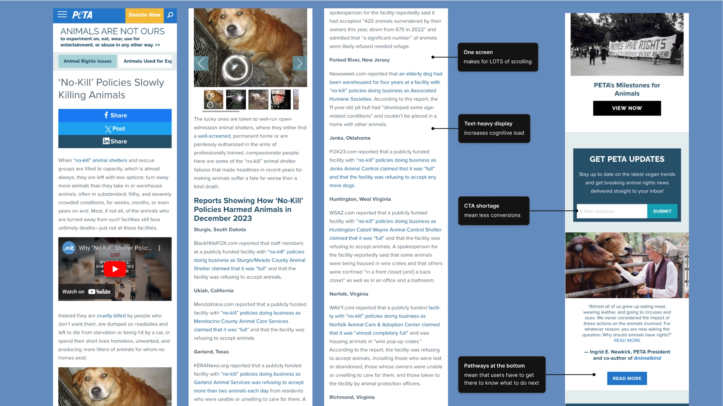 I started the project by conducting a competitor audit, to see how similar organizations were (or weren’t) addressing the topic. To my surprise, many animal-rights organizations championed no-kill as a solution to euthanasia; a sharp contrast to the position that PETA had adopted: that all no-kill shelters were inhumane, and that by encouraging people to avoid them, they could support a more humane approach.